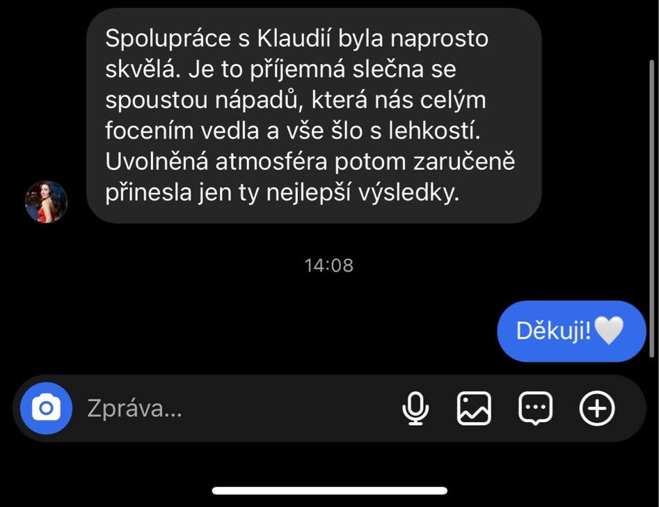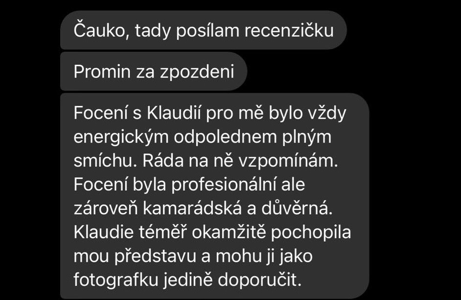 "Focení s Klaudií pro mě bylo vždy energickým odpolednem plným smíchu. Ráda na ně vzpomínám. Focení byla profesionální ale zároveň kamarádská a důvěrná. Klaudie téměř okamžitě pochopila mou představu a mohu ji jako fotografku jedině doporučit."