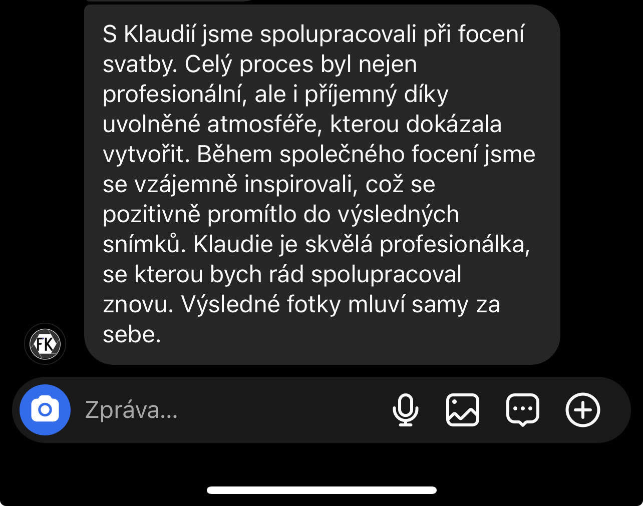 "S Klaudií jsme spolupracovali při focení svatby. Celý proces byl nejen profesionální, ale i příjemný díky uvolněné atmosféře, kterou dokázala vytvořit. Během společného focení jsme se vzájemně inspirovali, což se pozitivně promítlo do výsledných snímků. Klaudie je skvělá profesionálka, se kterou bych rád spolupracoval znovu. Výsledné fotky mluví samy za sebe."