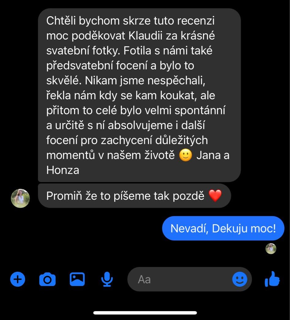 "Chtěli bychom skrze tuto recenzi moc poděkovat Klaudii za krásné svatební fotky. Fotila s námi také předsvatební focení a bylo to skvělé. Nikam jsme nespěchali, řekla nám kdy se kam koukat, ale přitom to celé bylo velmi spontánní a určitě s ní absolvujeme i další focení pro zachycení důležitých momentů v našem životě."