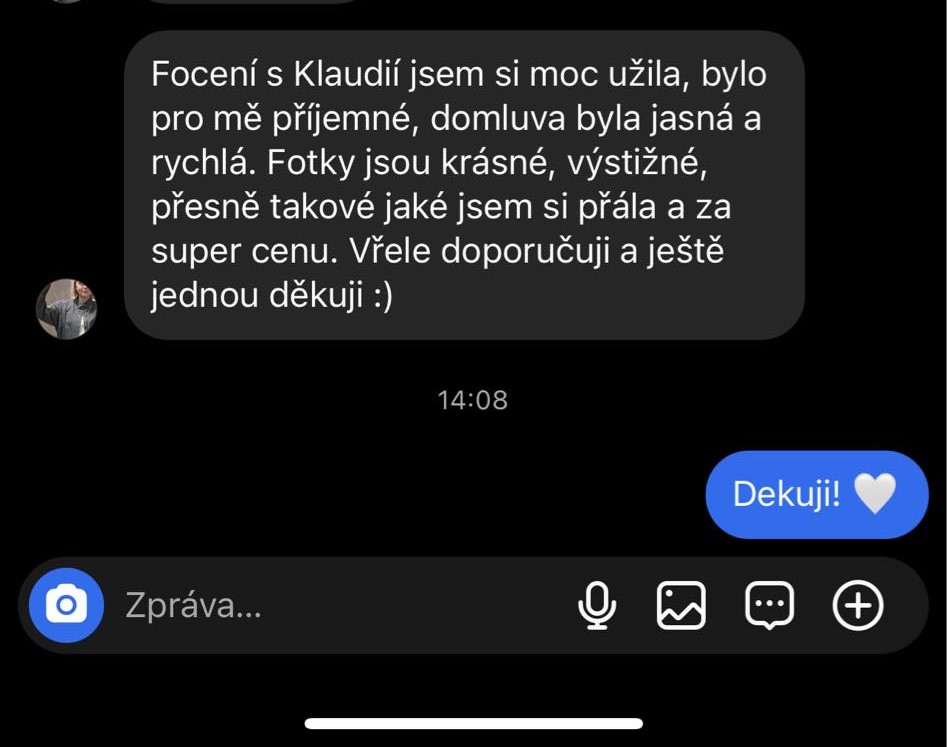 "Focení s Klaudií jsem si moc užila, bylo pro mě příjemné, domluva byla jasná a rychlá. Fotky jsou krásné, výstižné, přesně takové jaké jsem si přála a za super cenu. Vřele doporučuji a ještě jednou děkuji :)"