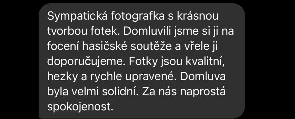 "Sympatická fotografka s krásnou tvorbou fotek. Domluvili jsme si ji na focení hasičské soutěže a vřele ji doporučujeme. Fotky jsou kvalitní, hezky a rychle upravené. Domluva byla velmi solidní. Za nás naprostá spokojenost."