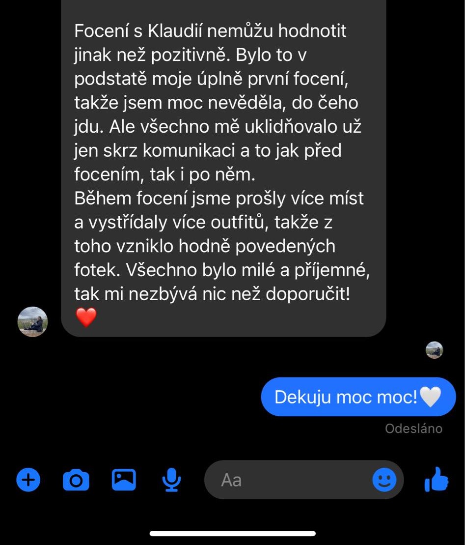 "Focení s Klaudií nemůžu hodnotit jinak než pozitivně. Bylo to v podstatě moje úplně první focení, takže jsem moc nevěděla, do čeho jdu. Ale všechno mě uklidňovalo už jen skrz komunikaci a to jak před focením, tak i po něm. Během focení jsme prošly více míst a vystřídaly více outfitů, takže z toho vzniklo hodně povedených fotek. Všechno bylo milé a příjemné, tak mi nezbývá nic než doporučit!"